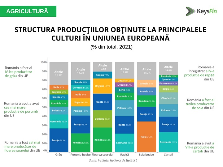 În ceea ce privește producția de grâu la nivelul UE, România a urcat cu 2 locuri în clasament, ajungând pe locul 4, cu 7,5% din total și o recoltă de 10,4 milioane de tone în 2021. România a ocupat în continuare primul loc la suprafața cultivată de porumb în rândul statelor membre ale Uniunii Europene, iar în anul post-pandemic producția realizată a fost de 14,8 milioane de tone, redevenind lider în ierarhia europeană.În plus, România a reușit să rămână cel mai mare producător de floarea soarelui din UE, cu o recoltă de 2,8 milioane de tone în 2021.